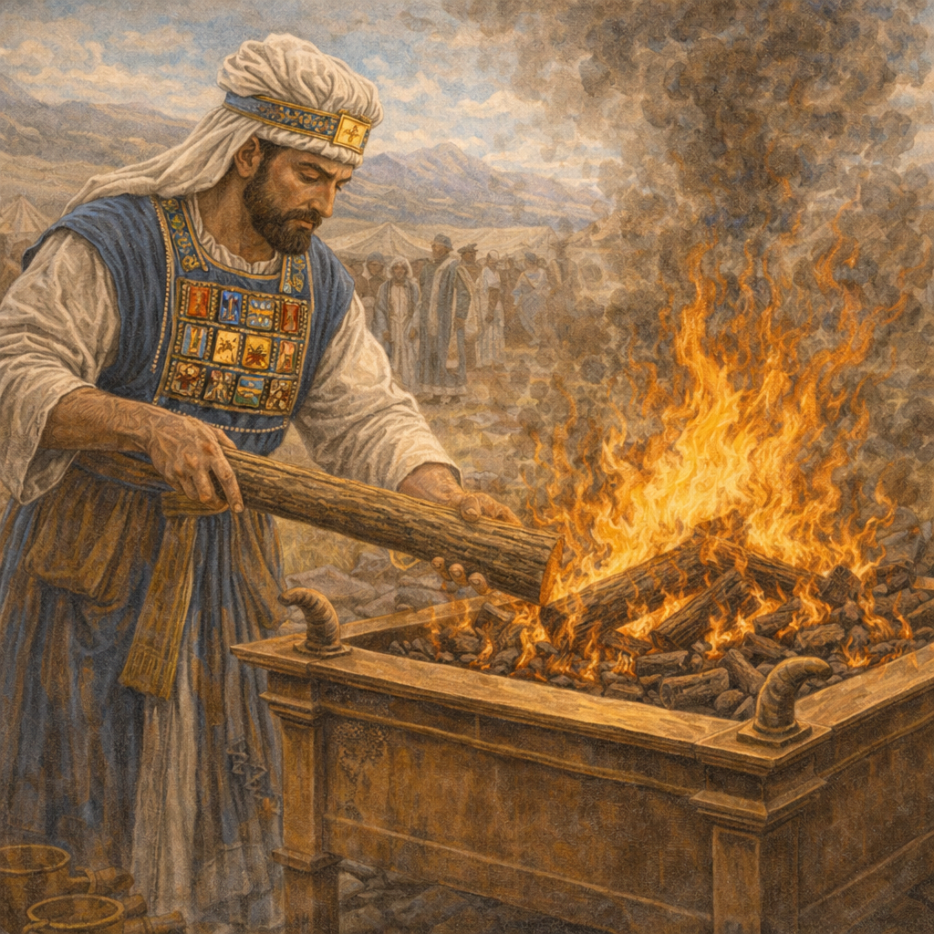 "Toto je zákon zápalnej obete... Oheň na oltári bude na ňom horieť, nevyhasne. Kňaz bude na ňom každé ráno zapaľovať drevo... Oheň bude na oltári neustále horieť, nevyhasne." (Leviticus 6:2–6)